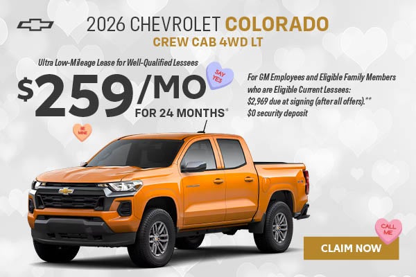*Tax, title, license, and dealer fees extra. Mileage charge of $0.25/mile over 20,000 miles at participating dealers. **For GM Employees and Eligible Family Members who are Eligible Current Lessees. Customer remains responsible for current lease payments. Each dealer sets own price. $259/month for 24 months. $2,969 due at signing (after all offers). Your payments may vary. Lessor must approve lease. No security deposit required. Lessee pays for maintenance, repair, excess wear and disposition fee (if applicable) at end of lease. Option to purchase at lease end for an amount to be determined at lease signing. Payments may be higher in some states. Not available with other offers. Take new retail delivery by 03-02-2026.