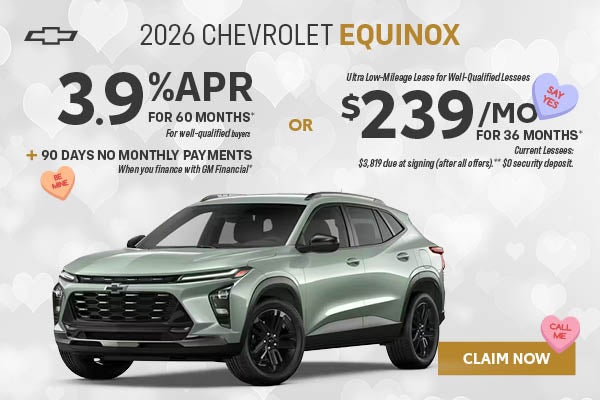 *3.9% APR for 60 months. Finance charges accrue from date of financing. Deferred monthly payments for 90 days. Monthly payment is $18.37 for every $1,000 you finance. Example down payment: 16.8%. Must finance with GM Financial. Not available in PA. Some customers may not qualify. Not available with lease and some other offers. Take new retail delivery 3/2/26.**For Current Lessees of a 2021 model year or newer GM or Non-GM passenger car or truck at least 30 days prior to the lease of a new GM vehicle through GM Financial. Customer remains responsible for current lease payments. Each dealer sets own price. $239/month for 36 months. $3,819 due at signing (after all offers). Your payments may vary. Payments are for a 2026 Chevrolet Equinox FWD LT with an MSRP of $29,995. Based on due at signing amount of $3,819 (after all offers). 36 monthly payments total $8,604. Must show proof of lease. Option to purchase at lease end for an amount to be determined at lease signing. Lessor must approve lease. Lessee pays for maintenance, repair, excess wear and disposition fee of $395 or less at end of lease. No security deposit required. Payments may be higher in some states. Not available with other offers. Take new retail delivery by 03-02-2026.